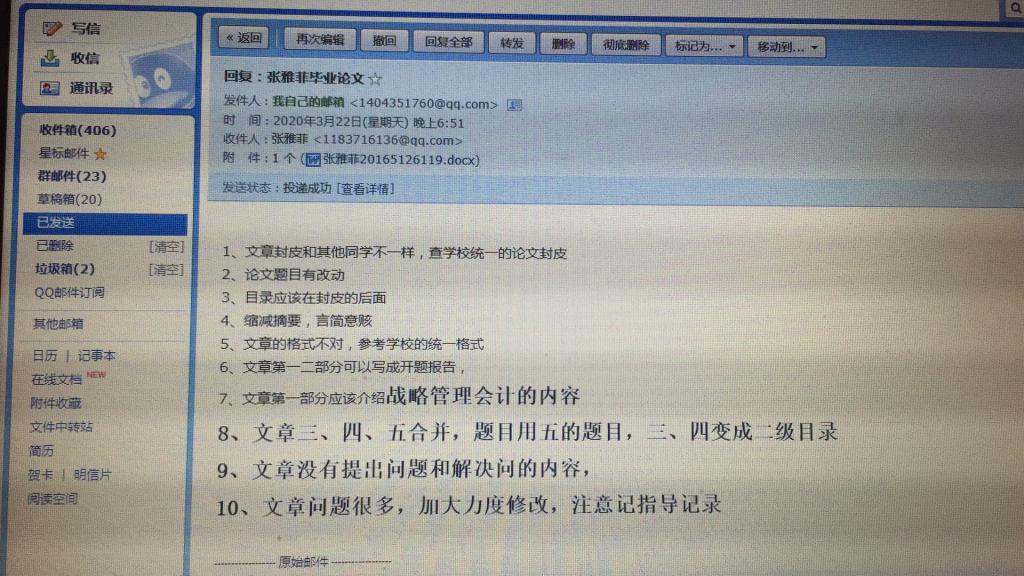 王珍教授利用电话与学生就毕业论文选题及写作框架进行沟通,提高了学生论文的写作效率。通过电子邮箱、微信等方式对学生的开题报告和论文初稿进行指导,将具体的修改意见及时发送给学生。目前大部分学生已经完成初稿。