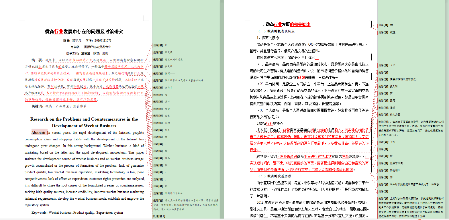 王璞玉老师通过word审阅做批注,再结合语音通话的方式对学生的毕业论文进行修改。学生能够清晰的看到老师给出的修改意见,及时对论文内容进行调整,大大提高了论文写作效率。