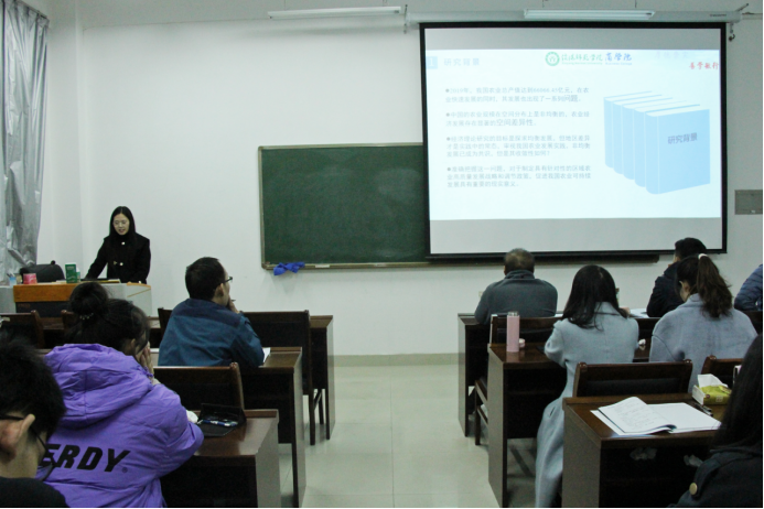 11月30日下午, 4k影视 在经管楼303教室举行2021年学术型研究生学术论坛答辩会。本次学术论坛由上官绪明、孔栋、李俊等教师担任评委,2021级全体学术型研究生参加旁听。