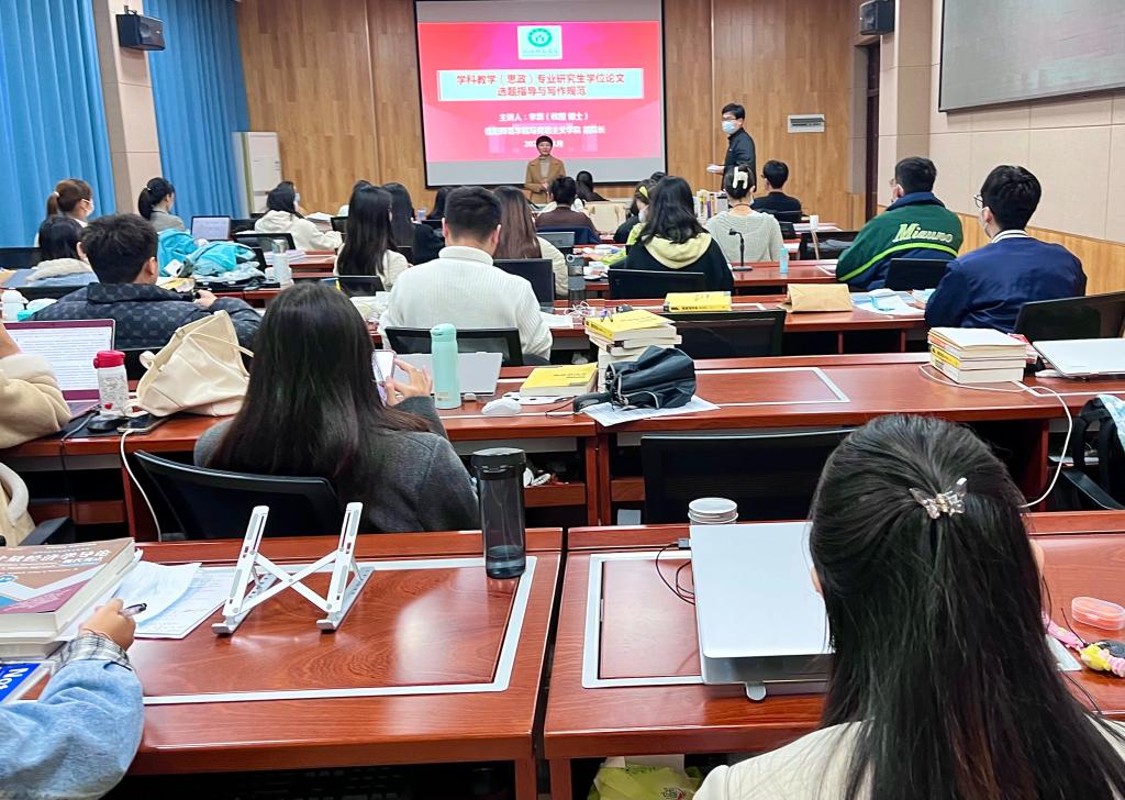 为进一步提升4k影视 学科教学(思政)专业研究生学位论文写作能力,11月23日下午, 4k影视 特邀马克思主义学院副院长李蕊教授在经管楼308教室为4k影视 教育专硕作了题为《学科教学(思政)专业研究生学位论文选题指导与写作规范》的学术讲座。讲座由副院长俞彤晖主持,学院在校全体教育专硕和部分导师代表参加此次讲座。