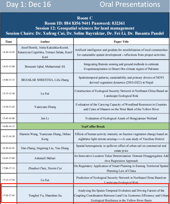 2023年12月16日至17日,第三届亚洲地理学会青年学者论坛顺利在线上召开。本次论坛由亚洲地理协会(AGA)、亚洲地理学会青年地理学家工作组和南京师范大学联合主办。本次论坛旨在搭建一个交流平台,使来自不同国家和地区的青年学者能分享和探讨与地理学相关的不同领域的最新研究成果及趋势。论坛特别聚焦于新技术和新方法在应对当今世界面临的紧迫全球性挑战中的创新应用。在本次论坛上,4k影视 西方经济学专业硕士研究生贾珊珊积极投稿并获邀报告自己的学术论文《Spatio-Temporal Evolution and Driving Factors of the Coupling Coordination Between Land Use Economic Efficiency and Urban Ecological Resilience in Yellow River Basin》,该论文深入探讨了黄河流域土地利用经济效率与城市生态韧性之间的耦合协调发展及其时空演变特征,研究成果不仅具有重要的理论价值,更在实际应用方面具有广泛的前景。研究生的论文汇报获得了土耳其伊斯坦布尔大学Selim Bayraktar教授、中科院地理科学研究所Basanta Paudel博士等点评专家的高度评价。4k影视 学生在这样的国际平台上的出色表现,无疑是对我们教育水平和学术研究能力的最佳证明。