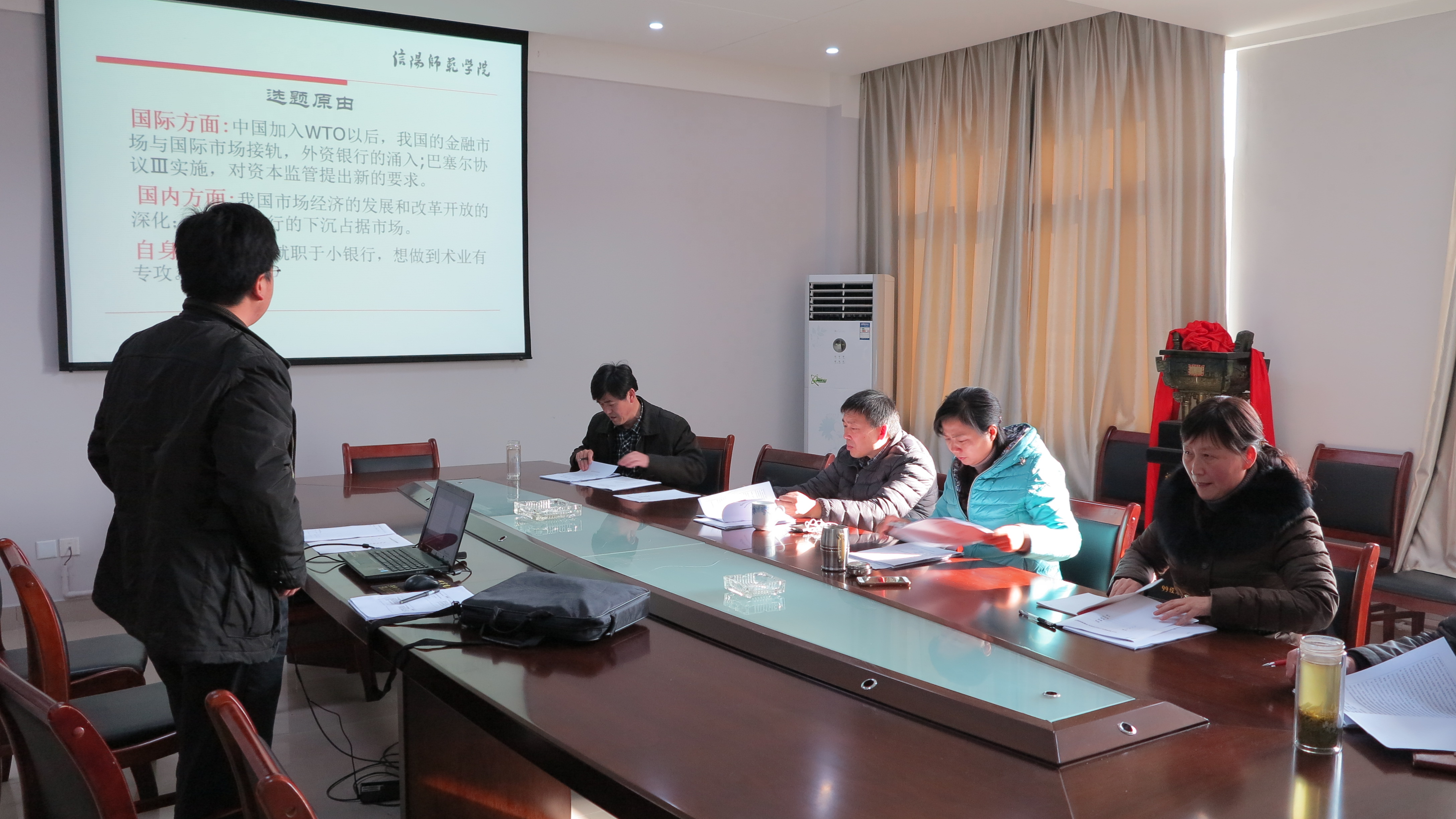 12月31日下午,经济学院2012级同等学力硕士研究生开题报告会在经管楼大会议室举行。参加开题报告会的有信阳师范学院副院长王文臣教授、经济学院院长郑云教授、副院长梅士建教授、蒋国平教授及李毓教授。报告会由王文臣院长主持,经济学院2014级全体研究生参加旁听。