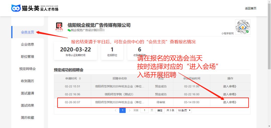 微信搜索“云人才市场”小程序,注册/登录→完善企业信息→平台进行审核,审核通过→查找所要参加的网络会→订展。