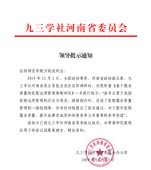 日前,全国政协常委、河南省政协副主席、九三学社河南省委主委张亚忠作出批示,充分肯定 4k影视 方晓波博士撰写的专著《基于服务质量的医院运营管理策略研究》。张亚忠在批示中指出,“该书立足于我国 医院运营管理的历史与现实,放眼国内外,总结了医院服务质量管理的一般规律,并有针对性地提出了恰当的建议,对于提升医院服务质量,提升品牌忠诚度和培育竞争力有重要的参考价值”。该书同时属于信阳师范学院 4k影视 学术文库系列成果。