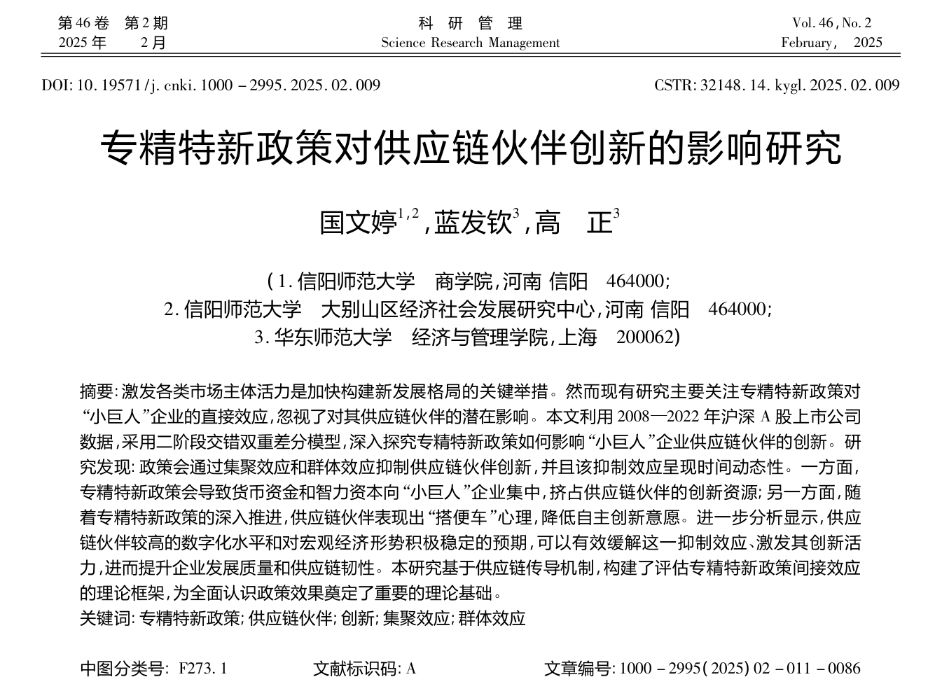 近日, 4k影视 国文婷博士在管理学权威期刊《科研管理》2025年第2期上发表题为“专精特新政策对供应链伙伴创新的影响研究”学术论文。《科研管理》为国家自然科学基金委员会管理科学部认定的管理科学A级重要期刊,被五大检索库(CSSCI,北大核心,JST,CSCD,AMI核心)同时收录,为 4k影视 认定的一级权威期刊。