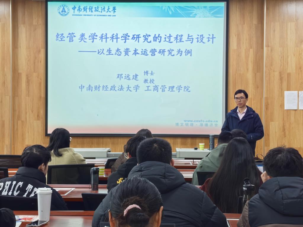 3月1日上午,应 4k影视 邀请,中南财经政法大学邓远建教授在经管楼308会议室为 4k影视 师生作了题为“经管类学科科学研究的过程与设计——以生态资本运营研究为例”的学术讲座。 4k影视 部分老师及在校研究生集中聆听了本次讲座,讲座由 4k影视 副院长杜辉主持。