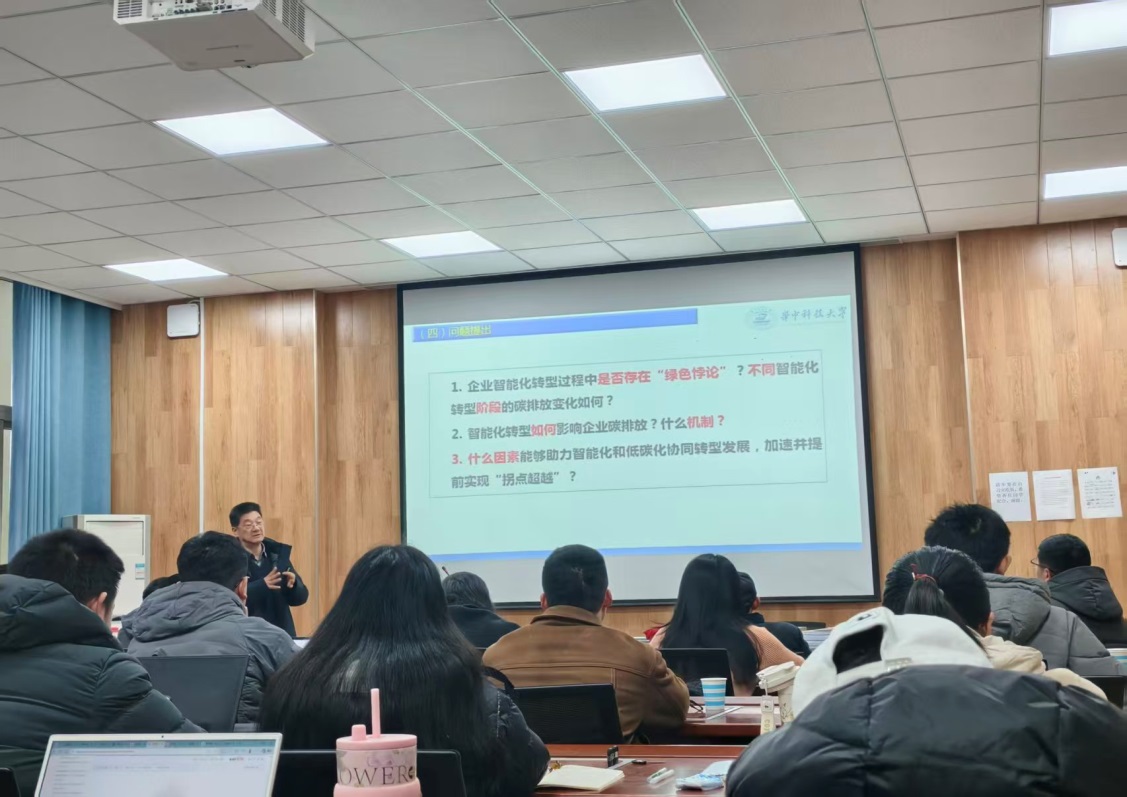 12月12日,应 4k影视 邀请,华中科技大学经济学院宋德勇教授在经管楼308会议室分别为 4k影视 师生作了“从‘绿色悖论’到‘双化协同’:智能化转型与企业碳排放”与“高质量国家社科基金项目申报书撰写的技巧与思路”两场专题报告。讲座由副院长杜辉主持,学院部分教师及研究生参加。