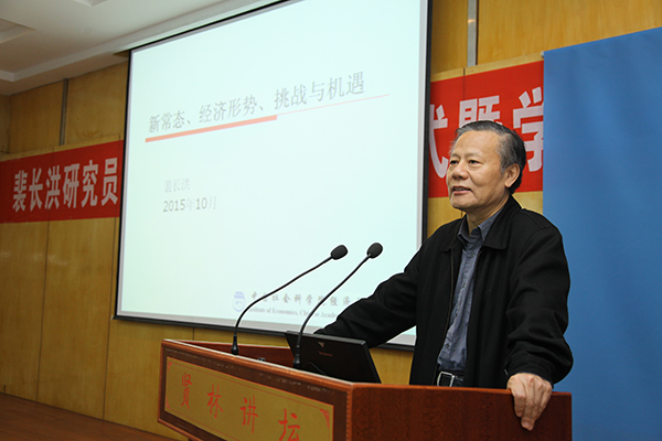 受聘仪式后,副校长齐城主持了报告会。裴长洪所长作了题为“新常态、经济形势、挑战与机遇”的学术报告。报告中,裴所长阐释了经济新常态的内涵、基本特征,重点分析了2015年前8个月我国经济运行的总体状况,透视了我国经济领域各方面所存在的问题与风险,最后展望了经济发展新阶段的优势与机遇。报告会持续了两个多小时,裴所长以深厚的理论功底、高瞻的眼光、丰富的数据资料、精辟的分析为全体师生奉上了一场精彩的学术大餐,多次赢得全场的热烈掌声。