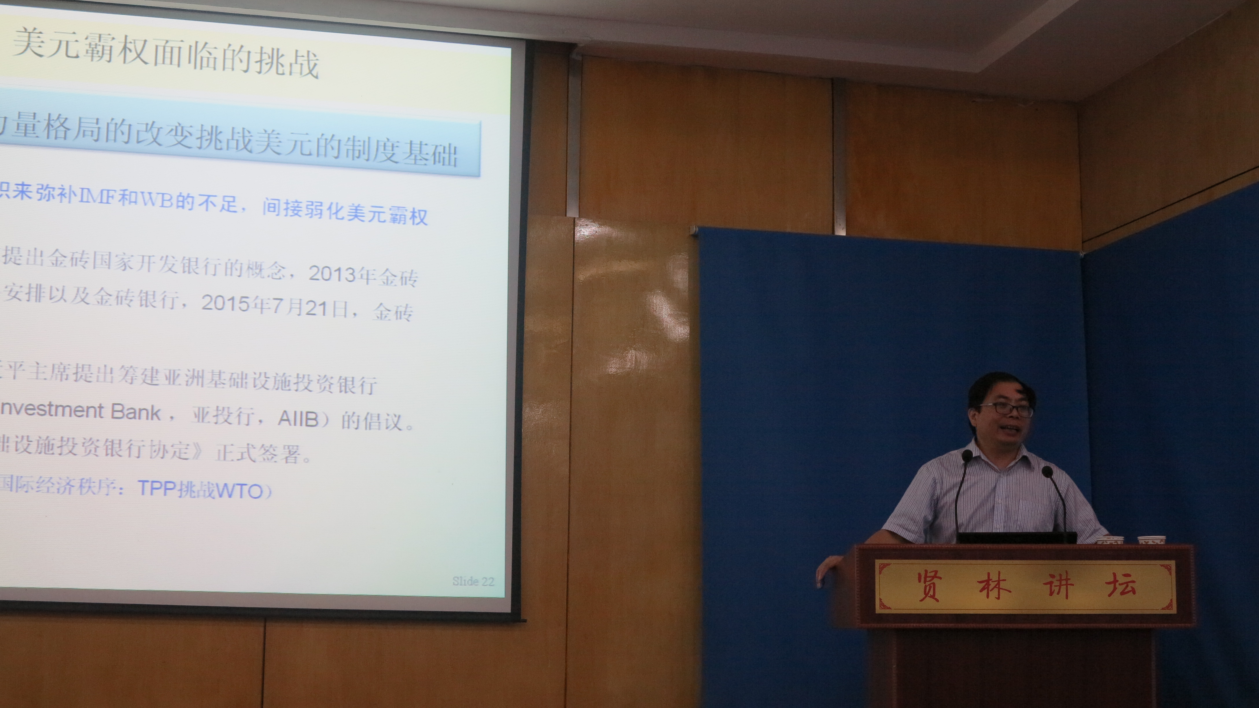 10月20日上午,应经济学院邀请,长沙理工大学博士生导师刘建江教授在贤林讲坛作了题为“后金融危机时代的美元霸权”的报告。报告会由副院长梅士建教授主持,经济学院师生参加了报告会。