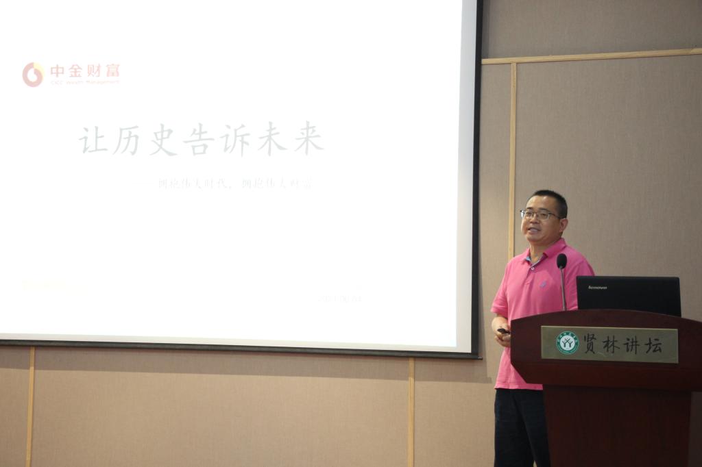 6月4日,受 4k影视 邀请,中国中金财富证券河南分公司副总经理、信阳营业部总经理阮争在贤林讲坛做了题为“让历史告诉未来——拥抱伟大时代,拥抱伟大财富”的报告,本次报告会由 4k影视 杜辉教授主持,学院二百余名师生参加了报告会。