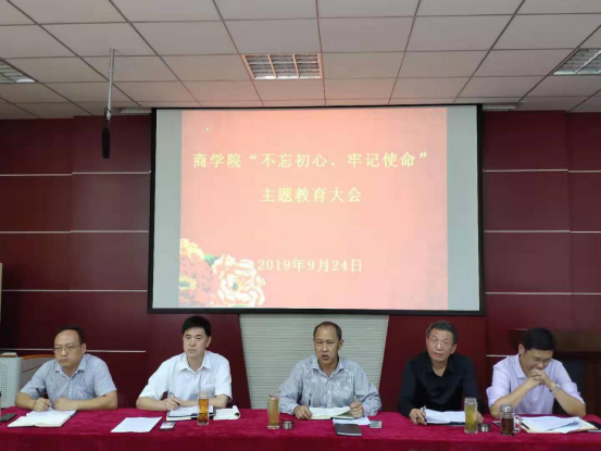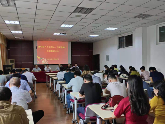 盛正国传达了学校关于开展“不忘初心、牢记使命”主题教育的实施方案,并从主题教育时间、要求、实施步骤等方面对学院主题教育工作进行了全面安排部署。他指出,“不忘初心、牢记使命”主题教育以处级干部为重点,覆盖全部基层党支部和党员,根本任务是深入学习贯彻习近平新时代中国特色社会主义思想,认真落实“守初心、担使命,找差距、抓落实”的总要求,锤炼忠诚干净担当的政治品格。他要求每位党员尤其是党员领导干部要有计划的学习《中国共产党章程》《习近平新时代中国特色社会主义思想学习纲要》《习近平关于“不忘初心、牢记使命”重要论述选编》等资料,学习贯彻习近平总书记关于教育的重要论述,尤其是习近平总书记在“不忘初心、牢记使命”主题教育工作会议上的讲话,认真学习党史、新中国史等,扎实开展主题教育,切实取得成效。