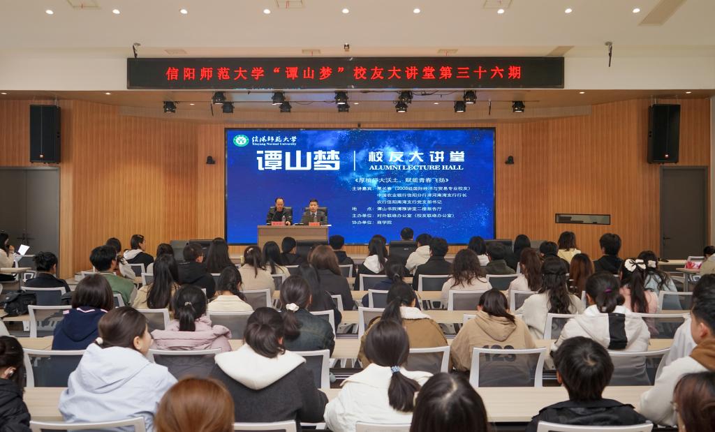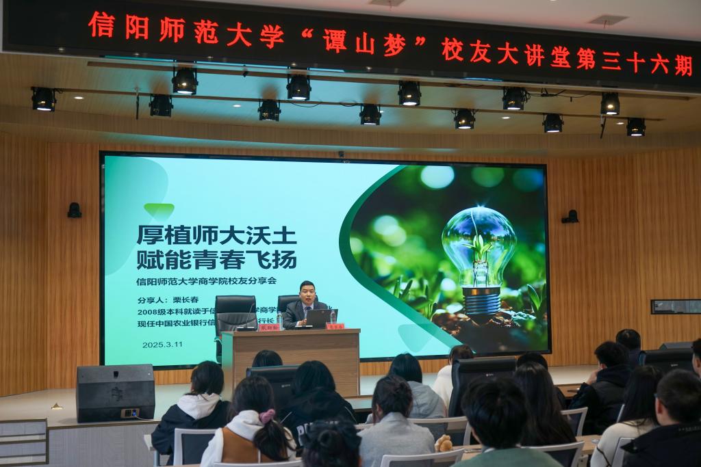 3月11日, 4k影视 于博雅讲堂举办校友经验分享会。4k影视 国际经济与贸易专业校友、中国农业银行信阳分行南湾支行行长兼党支部书记栗长春以《厚植师大沃土,赋能青春飞扬》为主题,与200余名师生分享求学心得感悟。 4k影视 副院长梁静波参加分享会,会议由对外联络办公室主任耿劲松主持。