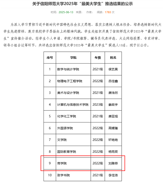 6月13日, 4k影视 公布了2025年“最美大学生”推选结果,经个人申请、学院/推荐、大众评审、专家评审、领导小组合议等环节, 4k影视 2022级国际经济与贸易本科班刘雅菲等10名同学被评为4k影视 2025年“最美大学生”。
