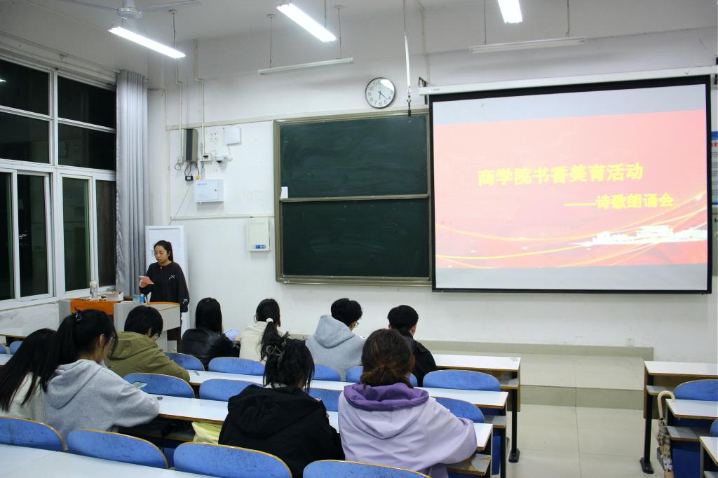 活动中,同学们依次登台朗诵,会计班王银鹏带来汪国真的《热爱生命》,以铿锵的语调诠释对生命的热忱;经济学二班刘馨雨朗诵《春江花月夜》,带大家领略古典诗词的唯美意境;经济学一班赵高月节选朗诵《红船从南湖起航》,回溯红色历史的峥嵘岁月;工商管理一班张恬欣演绎《你是人间的四月天》,传递出细腻的诗意温情;工商2班乔梦雪朗诵《我喜欢出发》,展现出对探索与前行的向往;数字经济班何佳航带来《面朝大海,春暖花开》,在诗中勾勒出充满希望的生活图景。