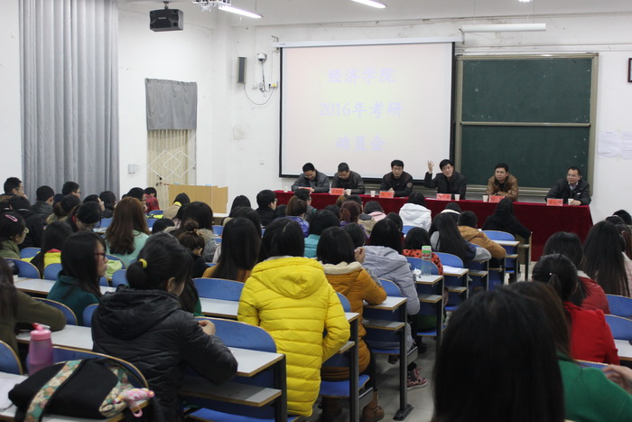 3月19日夜晚7点半,经济学院2016年考研动员在经管楼103教室隆重召开。副院长梅士建教授主持会议,教师代表杜辉,陈俭,袁庆禄,余元明,徐孝新等出席会议,2012级经济学、国际贸易全体同学及2013、2014级部分同学参加了动员会。会上,考研同学就考研应注意的诸多问题如:报考学校与专业如何选择?如何分配复习时间?高数水平如何快速提高?学术型硕士和专业硕士的区别等提问。教师们分别作出一一解答,会场上不时爆发热烈的掌声。最后梅院长做出总结,他指出:经济学院领导班子高度重视考研,一如既往鼓励、支持考研工作,厚植考研文化。同时,要求同学们一是要坚定理想信念,树立考研目标;二是要有坚韧的毅力,持之以恒;三是要掌握科学的复习方法;四是要主动适应考研新常态。
