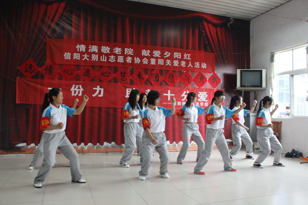 公益服务部部长提前联系了信阳市大别山志愿者协会,联合他们给老人们准备了精彩的节目。他们为老人们献上了欢快的舞蹈与精彩的表演,让在座的老人们情不自禁地跟着轻轻晃动起来,还有经典戏曲的演唱,同样让老人们听得津津有味,使得整个活动现场气氛热烈。随后,我们还组织部员们一起去老人们的房间,陪他们聊天,同学们有趣的话题逗得她们开怀大笑。紧接着我们帮他们收拾了房间,做一些力所能及的事情。最后我们献上了我们爱心募捐的书籍,一摞摞的书,是我们爱的表达和传递,大家与老人们以及敬老院的相关负责同志拍照作为留念。