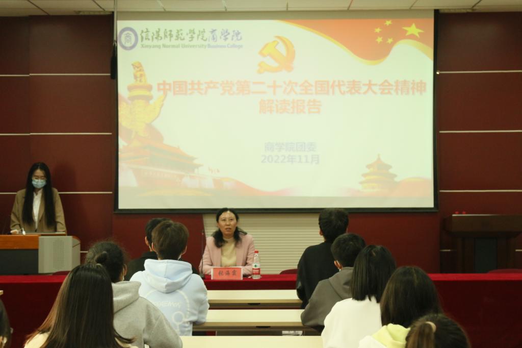 为深入学习贯彻宣传党的二十大精神,11月17日上午,4k影视 在经管楼310会议室召开党的二十大精神解读报告会。 4k影视 党委副书记张海霞出席会议并担任主讲人,全体学生干部参加本次会议。