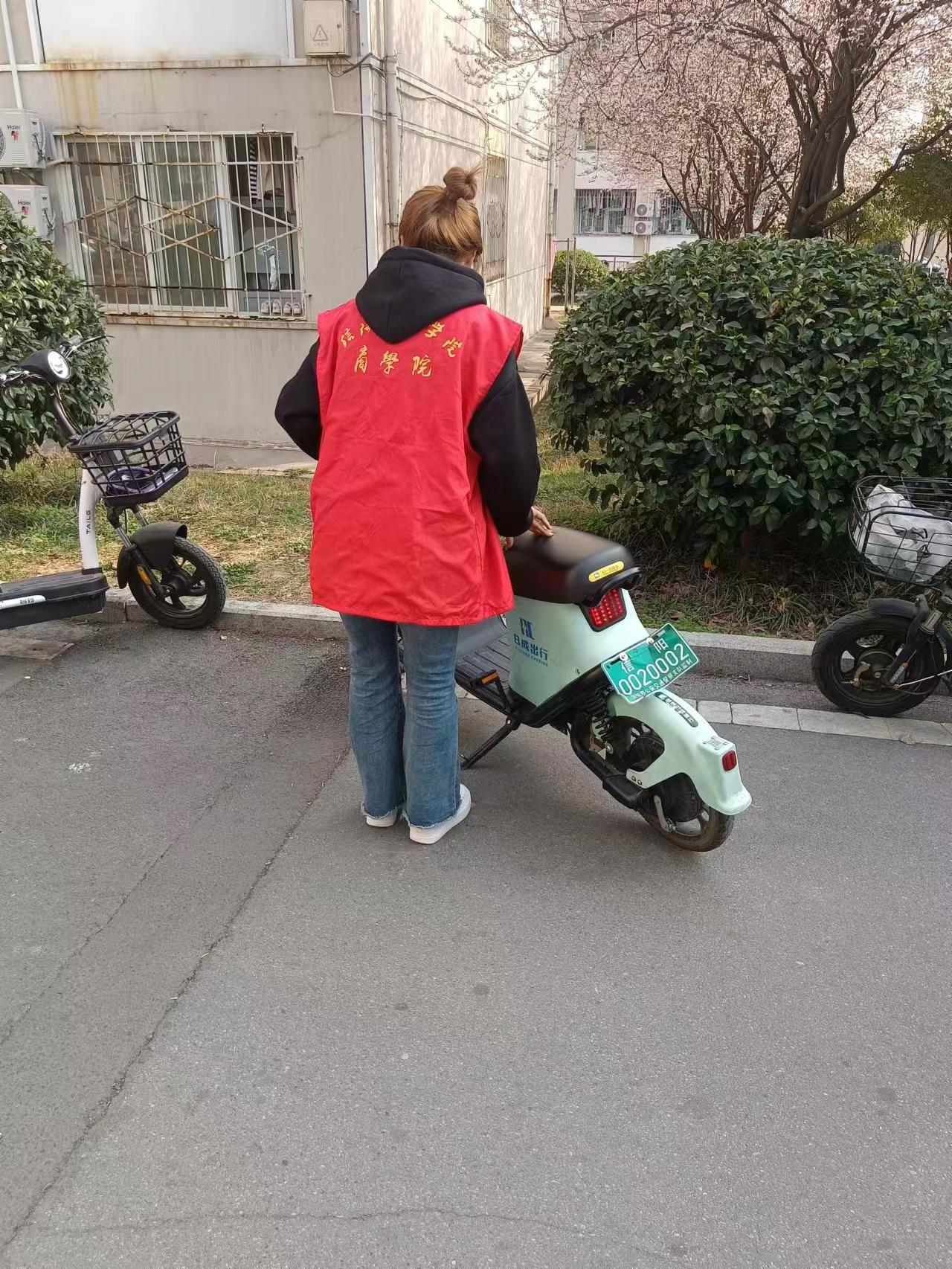 中午,志愿者们来到校园,将教学楼和宿舍楼前没规范停放的电动车、自行车挪到指定区域,为保护整齐优美的校园环境贡献力量。