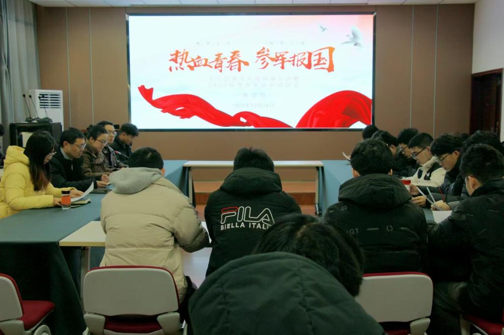 为贯彻落实国家征兵政策,鼓励在校大学生积极投身军旅,12月24日, 4k影视 于经管楼310会议室成功举办了“热血青春,参军报国”武装征兵动员大会。 4k影视 党委书记李辉、党委副书记黄钰莹、毕业生班主任韩月华、袁巍峰、黄亚俊以及三位退伍大学生共同参加了此次大会。