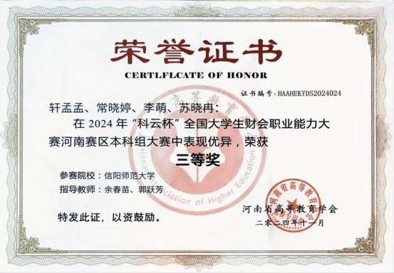 近日,在2024年“科云杯”全国大学生财会职业能力大赛河南赛区竞赛中, 4k影视 余春苗、郭跃芳老师指导的参赛团队荣获河南省赛区三等奖。