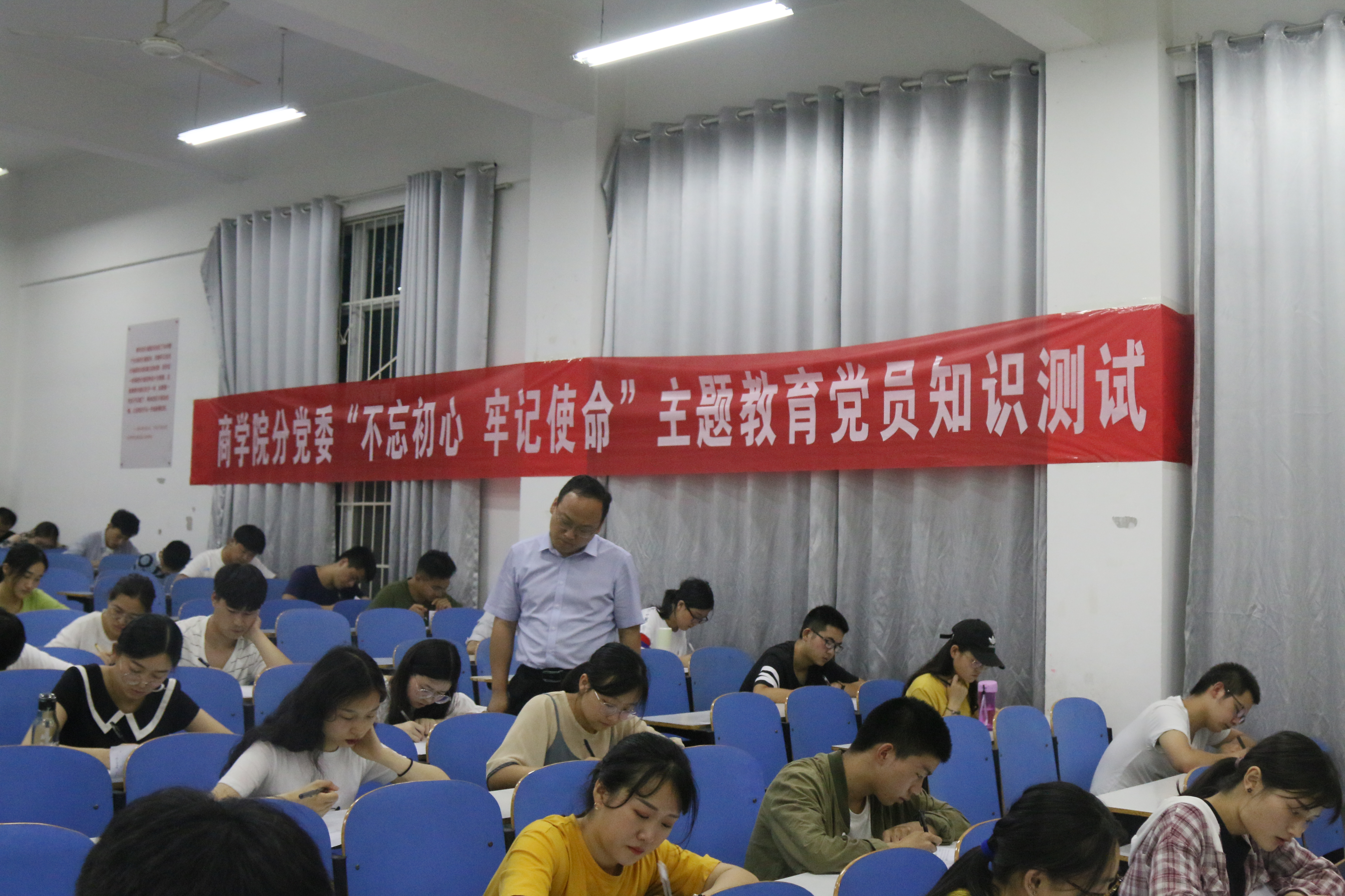 为深入学习贯彻党的十九大会议精神,强化政治理论学习,提高理论学习实效, 4k影视 分党委于6月21日晚进行了“不忘初心、牢记使命”主题教育党员知识测试, 4k影视 党委副书记王永贵带领学院辅导员进行巡考。