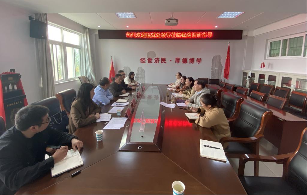 10月28日,招生就业处处长赵明民、副处长王松亭、张楠带领招生就业处工作人员来4k影视 调研指导招生与就业创业工作,学院院长彭荣胜、党委副书记张海霞、就业秘书黄亚俊等相关人员参加会议。