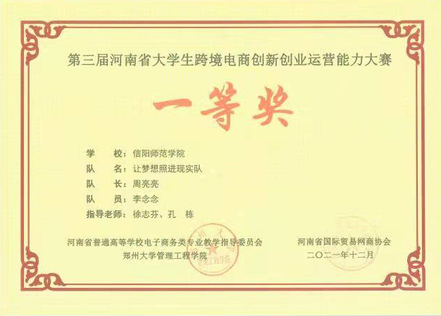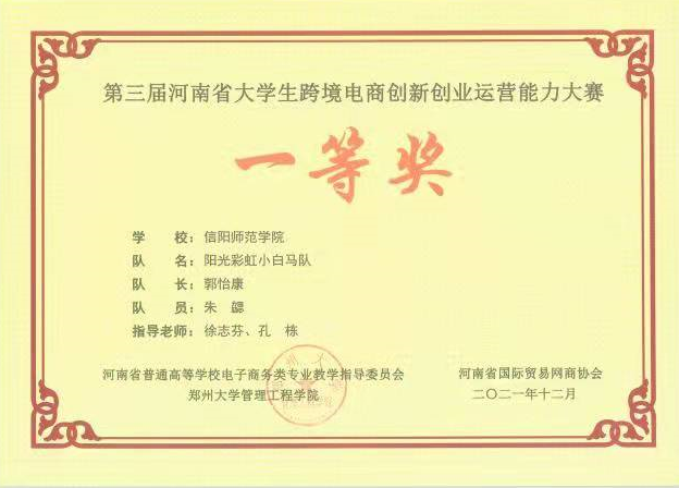 近日,第三届河南省大学生跨境电商创新创业运营能力大赛圆满落幕,4k影视 “阳光彩虹小白马”和“让梦想照进现实”两支代表队分别荣获一等奖,徐志芬、孔栋两位老师分别荣获“优秀指导老师”,并荣获“优秀组织奖”。