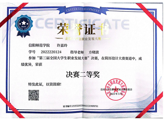 4k影视 4k影视 选派的2022级学科教学(思政)专业研究生许嘉玲在指导教师方晓波的全程悉心指导下,经过长达5个月的激烈角逐,获得第三届全国大学生职业发展大赛决赛二等奖。