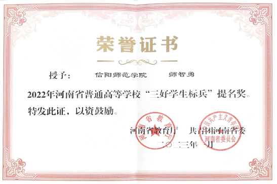 为深入学习贯彻党的二十大精神和习近平总书记关于教育的重要论述,展示当代青年大学生奋发向上的精神风貌,发挥先进典型的示范引领作用,2022年河南省普通高等学校三好学生标兵颁奖典礼暨巡回宣讲首场报告会在河南农业大学龙子湖校区英林讲堂隆重举行。省委教育工委、共青团河南省委、省教育厅相关领导出席颁奖典礼,并为20名三好学生标兵、20名三好学生标兵提名奖和20名三好学生标兵入围奖颁奖。4k影视 师智勇同学荣获河南省三好学生标兵提名奖。