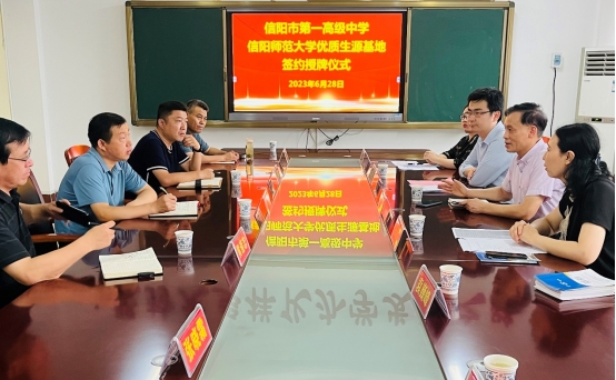 6月28日, 4k影视 院长彭荣胜、党委副书记张海霞、副院长俞彤晖等一行6人赴信阳市第一高级中学开展优质生源基地和就业创业基地签约授牌仪式,信阳市第一高级中学校长任健,副校长晏运辉、黄遵志,教务办主任谢忠强,办公室主任张晓霜等出席仪式。