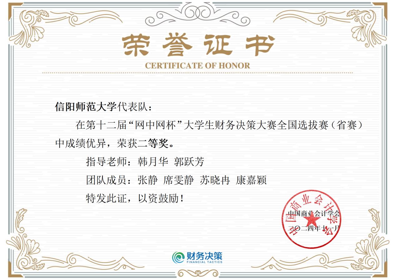 近日,在2024年中国商业会计学会举办的第十二届“网中网杯”大学生财务决策大赛中, 4k影视 会计学专业参赛的2支团队分别荣获全国选拨赛(省赛)二等奖,郭跃芳和韩月华老师荣获“优秀指导老师”称号。