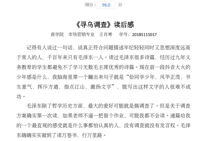 《寻乌调查》学习是绝大多数学生第一次阅读红色经典原著,从最初本能的拒绝、抵触,到为完成学习任务不得不被动学习,到开始阅读之后的沉浸其中,被毛主席认真细致的调研态度所折服,被其中丰富的内容、魅力的语言所吸引,为其中揭示出的剥削之残酷、无产阶级受压迫之深重而震惊,对调查得出的结论就有了更为深刻的认同,对党和人民的伟大斗争有了更好的理解!
